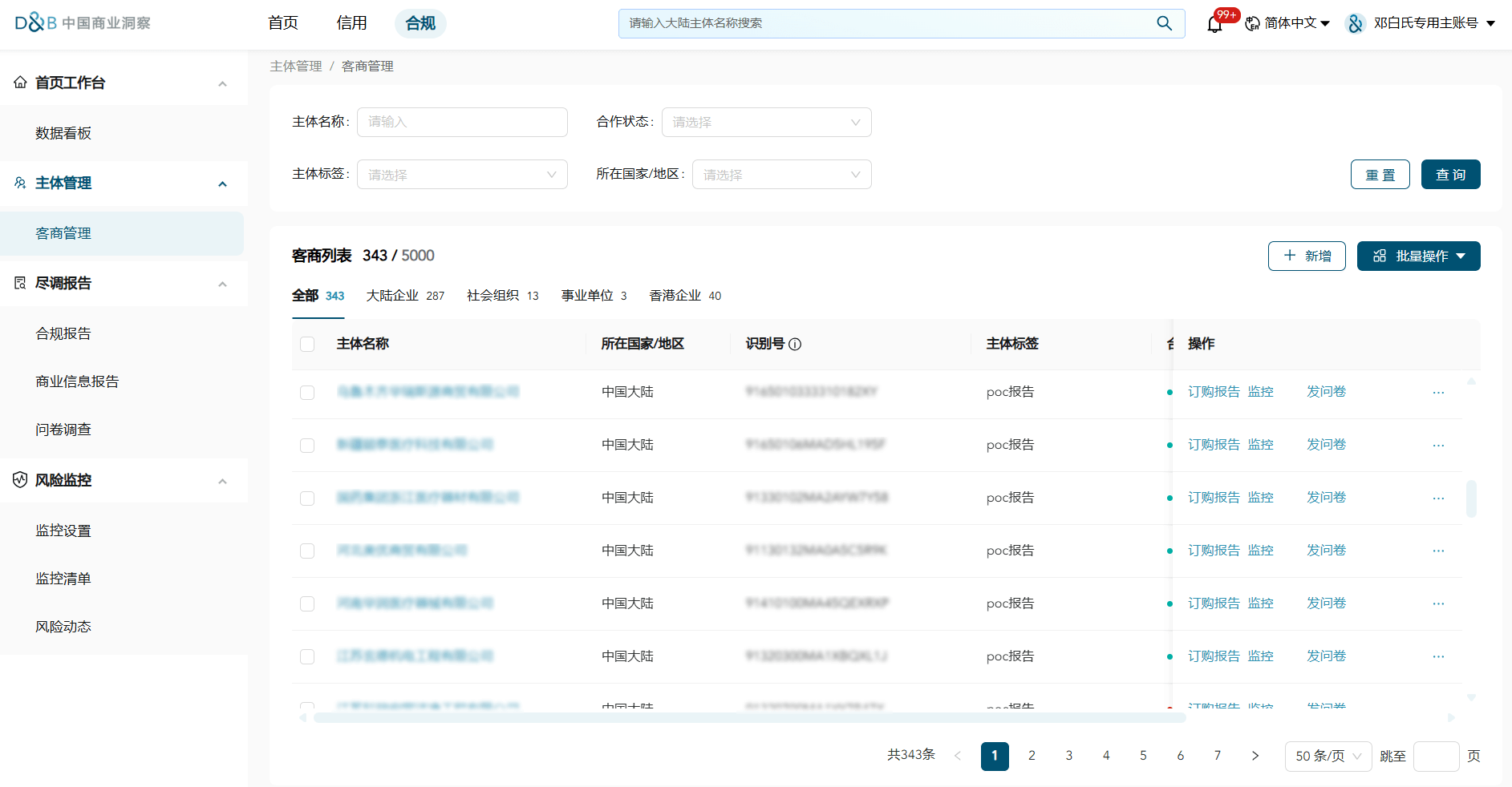 实现目标主体全生命周期管理,主体信息一站式录入与精细管理,支持随时增删改查,以及一键完成报告订购、问卷发起和监控启动。通过有效标签分类,快速筛选目标主体,助力高效决策与合作进程掌控。