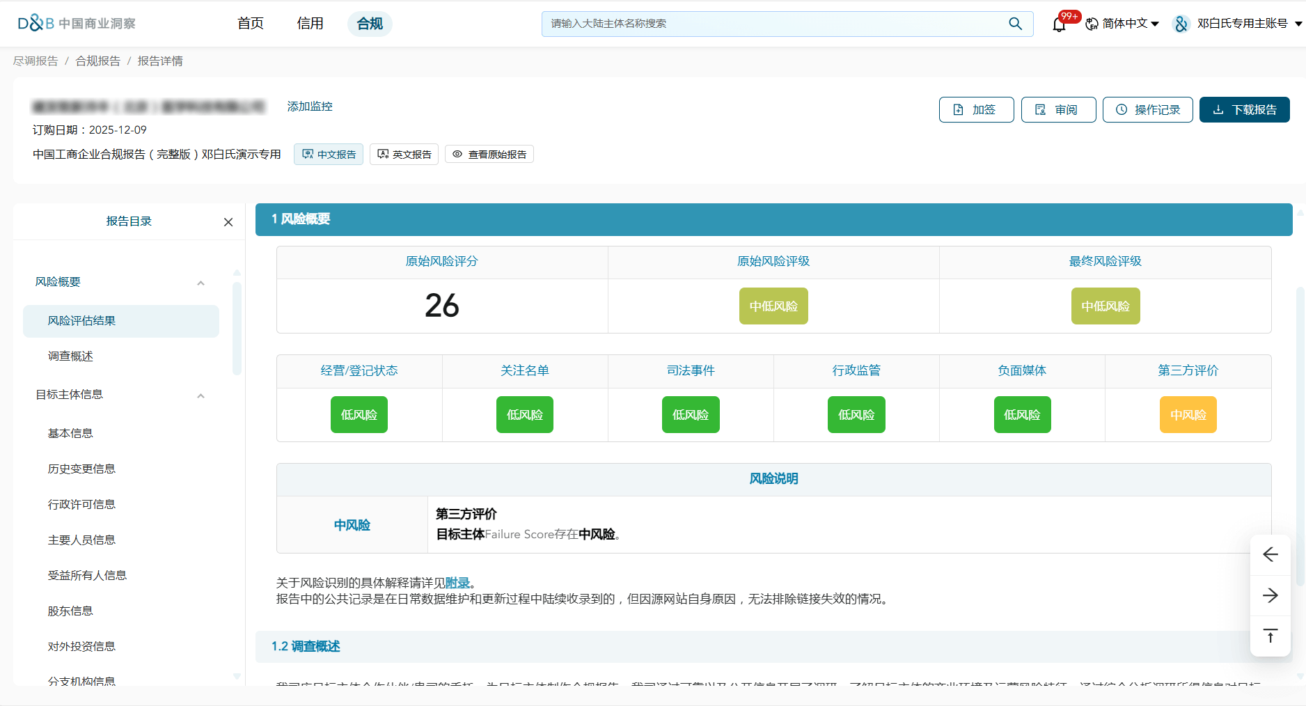 平台支持批量管理目标主体、审阅及下载合规尽职调查报告,大大提升合规管理团队的工作效率。