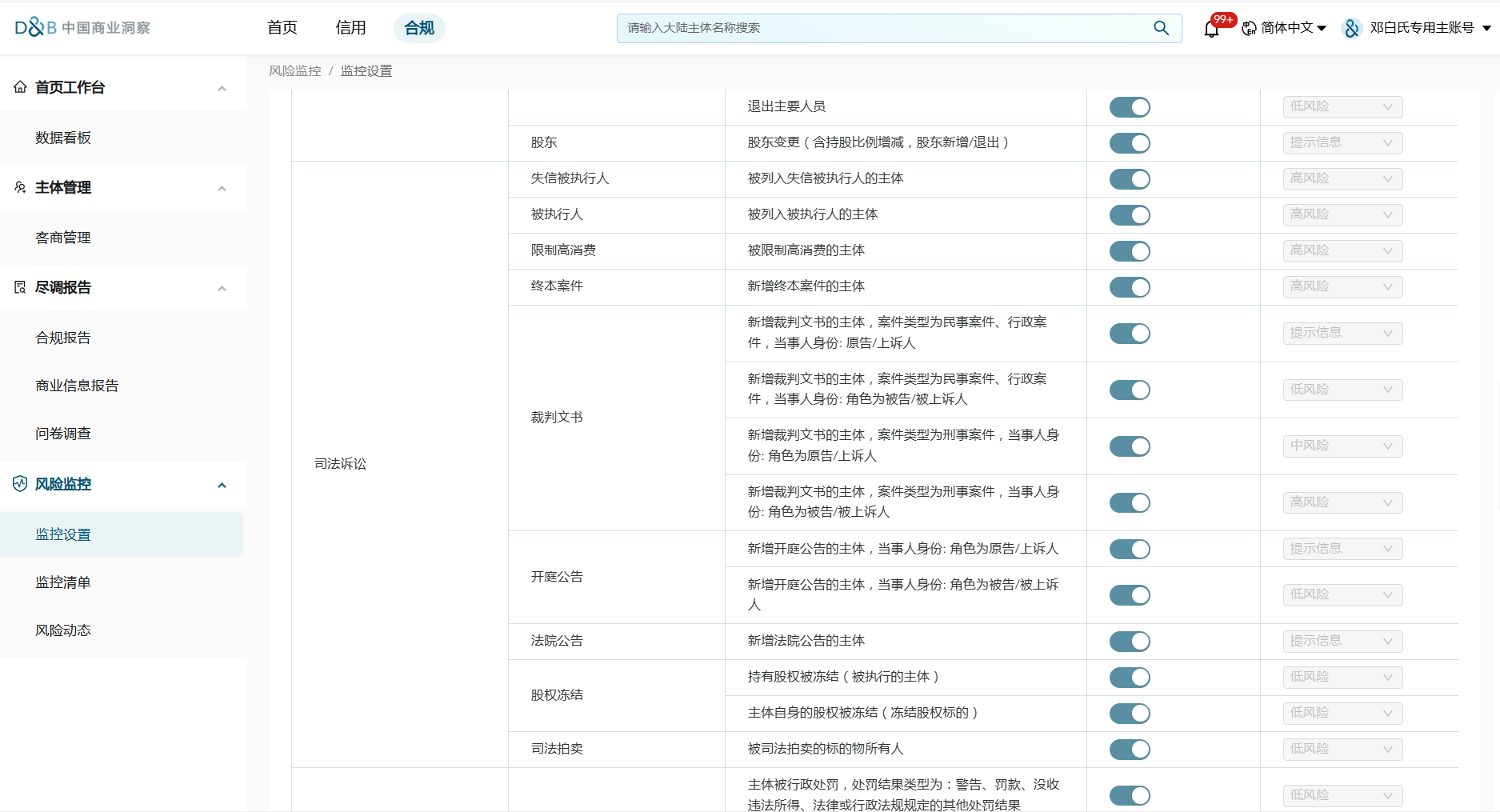 邓白氏中国商业洞察 – 合规模块,是聚焦合规风险管理的全流程智能化工具,基于邓白氏合规尽职调查方法论,为企业提供覆盖准入、身份识别、风险筛查、评估与持续监测的一站式解决方案。