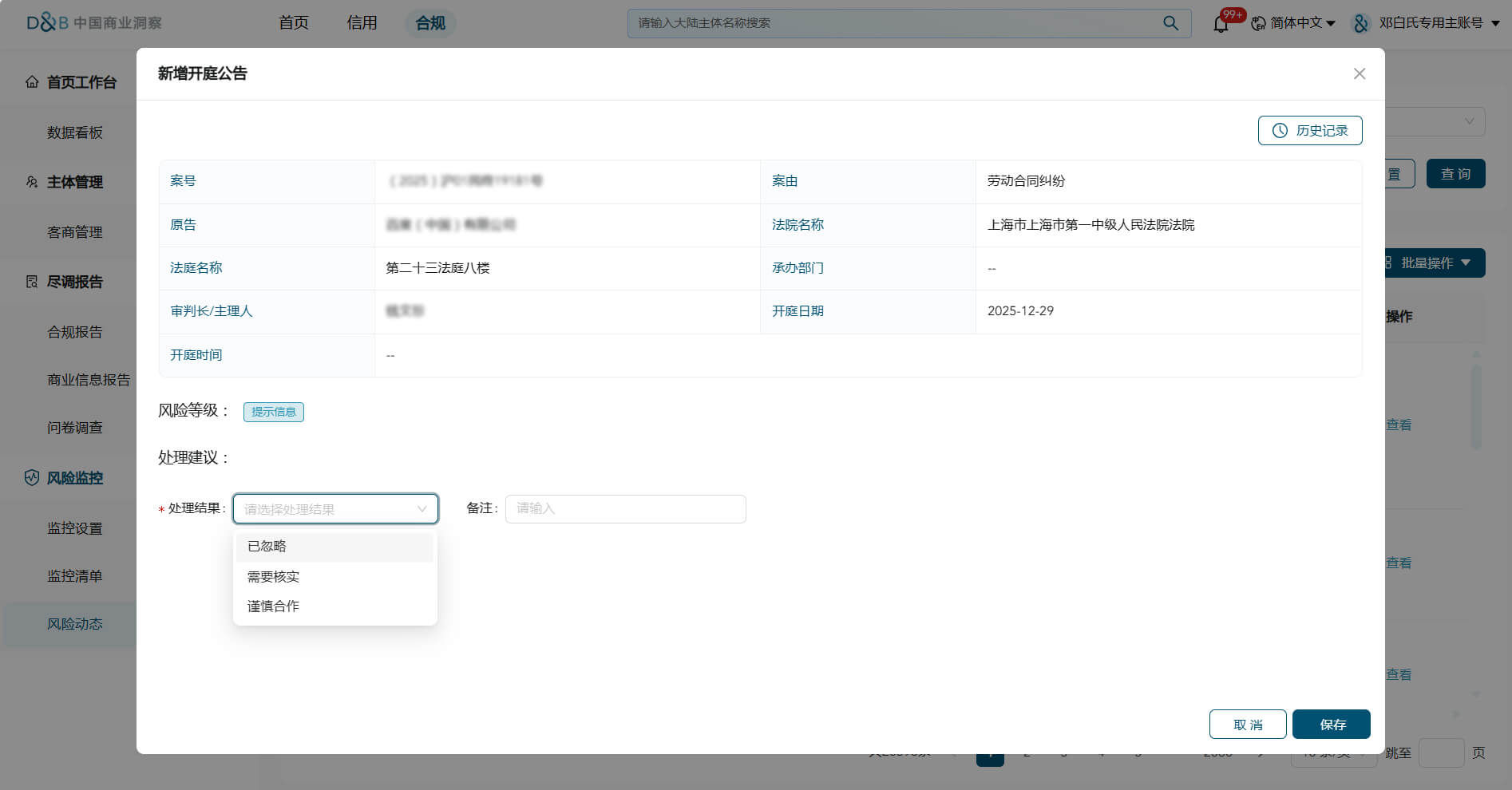 支持针对风险事件选择预设处置结果,并添加备注,方便后续追踪与管理。