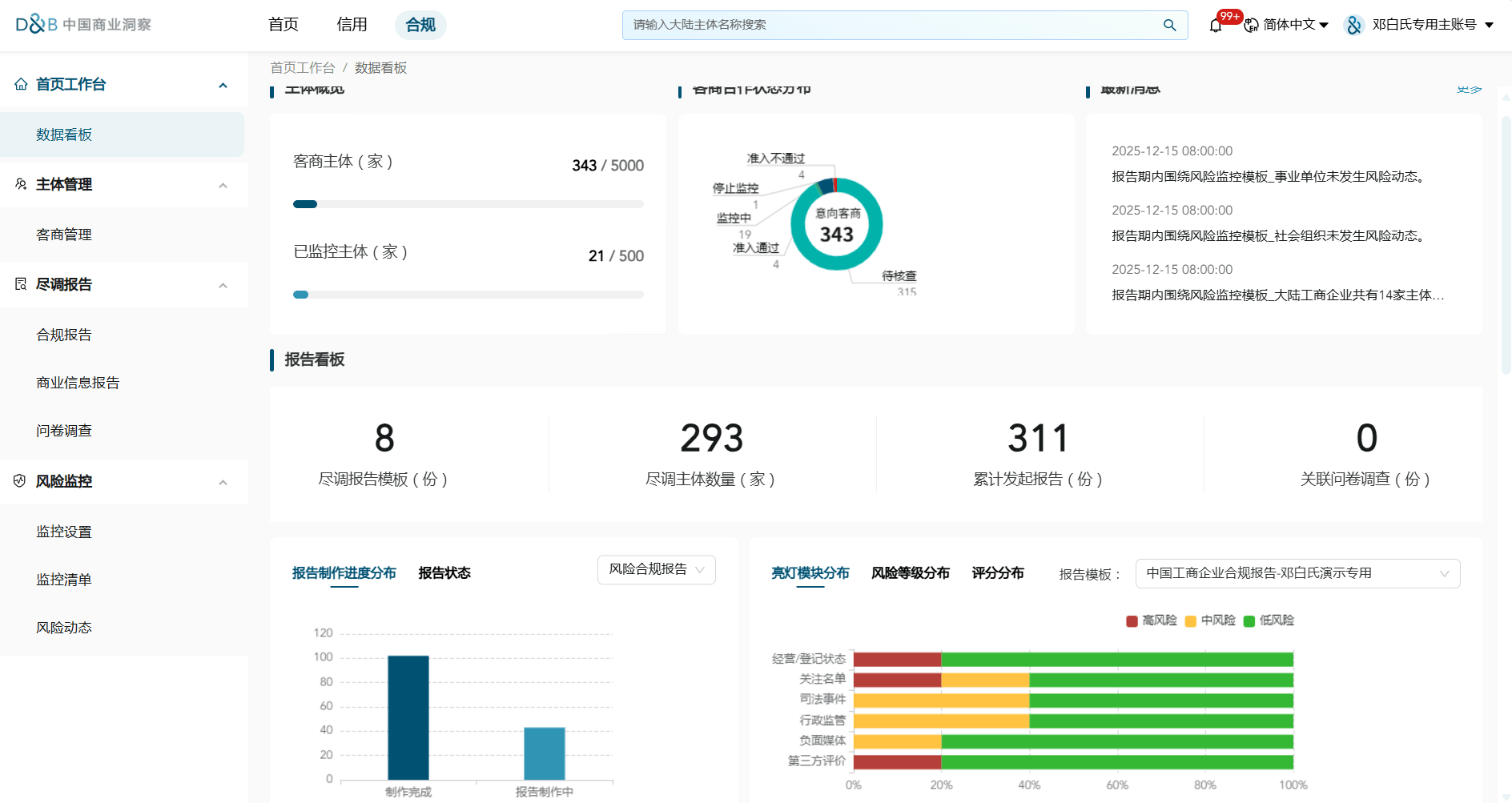 多板块展示目标主体管理、报告制作进度、风险事件趋势等平台数据统计,助力用户了解客商全貌、掌握动态资讯、明晰合规风险态势并制定管理处置策略。